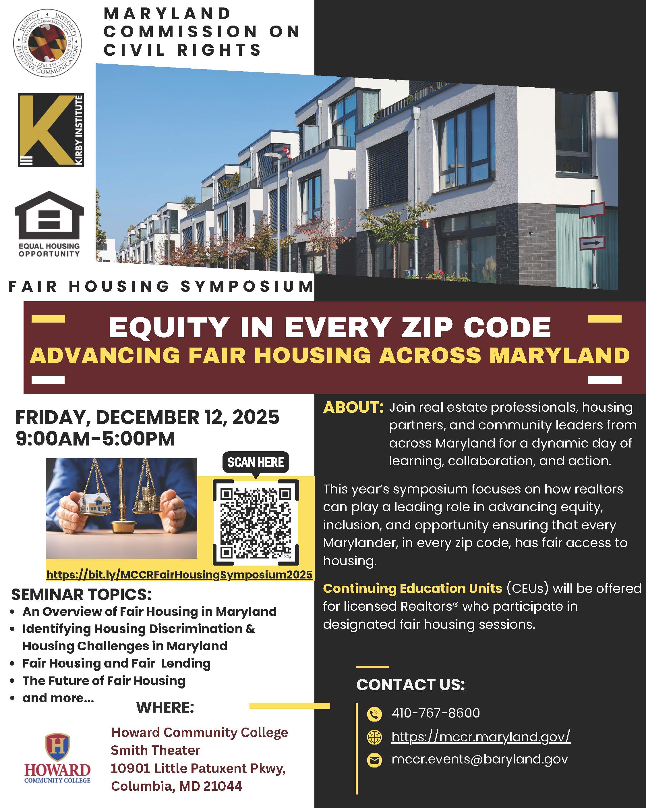 The Maryland Commission on Civil Rights is presenting a symposium focusing on how REALTORS can play a leading role in advancing equity, inclusion, and opportunity ensuring that every Marylander, in every zip code, has fair access to housing. Opportunity to earn CE credits. Offered in-person as a 1 full-day session from 9AM-5PM on 12/12/25. Location: In-Person at Howard Community College, Smith Theater, 10901 Little Patuxent Pkwy, Columbia, MD For More Information Please visit: https://bit.ly/MCCRFairHousingSymposium2025