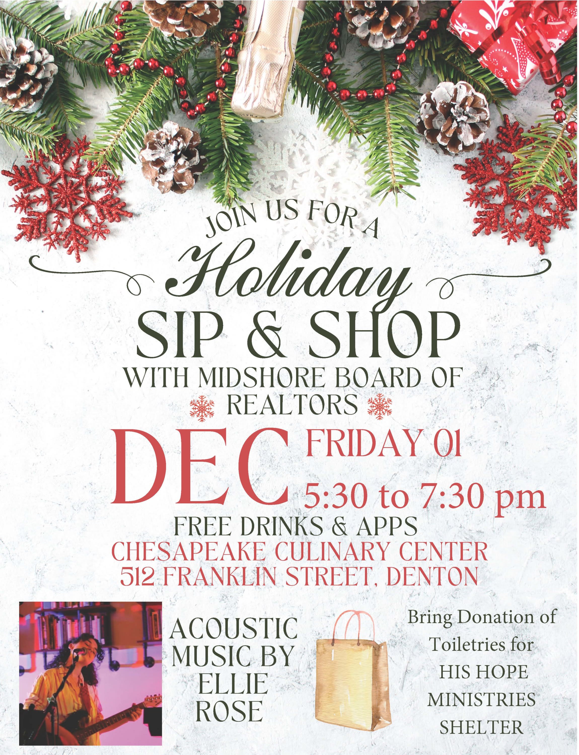 Join us for a Holiday Sip and Shop. Friday, December 1st from 5:30 to 7:30 at the Chesapeake Culinary Center, 512 Franklin St, Denton. There will be free drinks and appetizers; live music; shopping with local vendors; gift wrapping; and a hot chocolate bar! Bring a donation of toiletries for the His Hope Ministries Shelter.Images