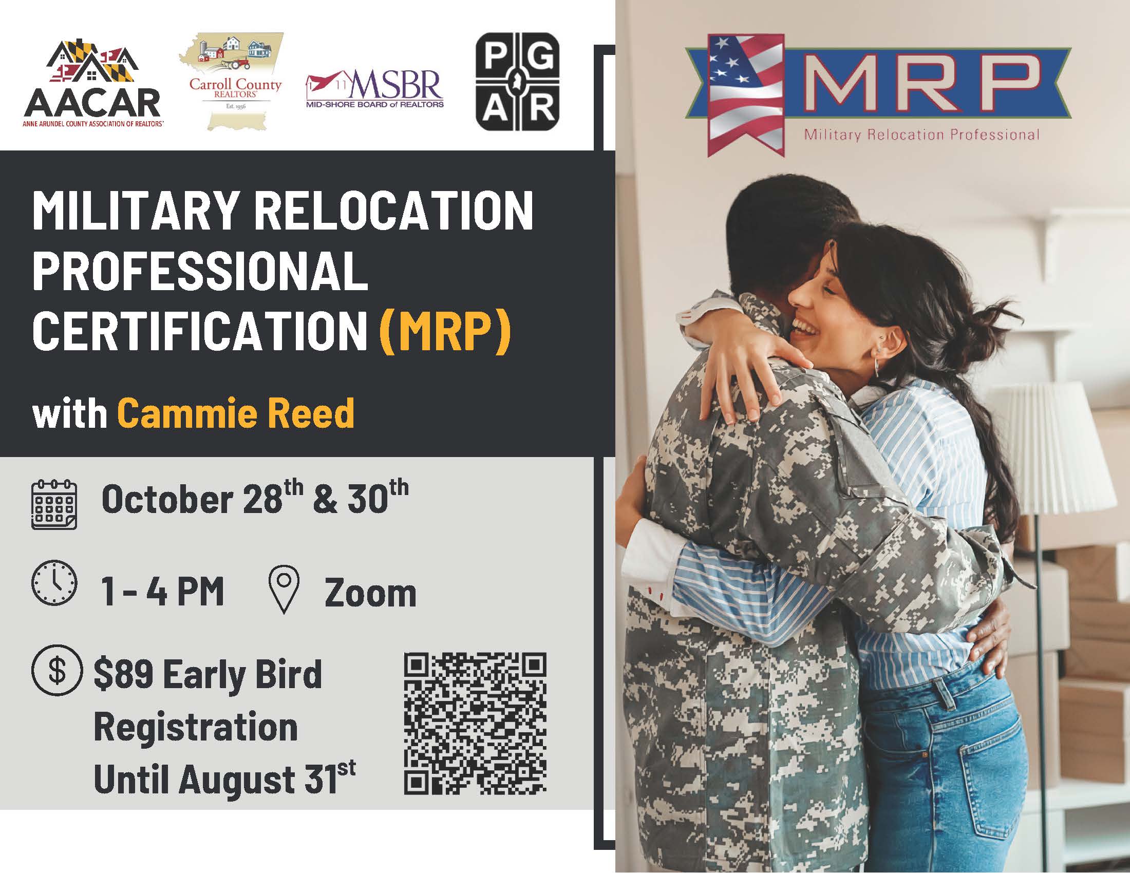 The Military Relocation Professional Certification (MRP) certification is for real estate professionals who want to work with current and former military service members. The MRP Certification educates REALTORS about working with U.S. service members and their families and veterans to find housing solutions that best suit their needs and to take full advantage of available benefits and support. Offered virtually as a 2-day session from 1PM-4PM on 10/28 & 10/30. Cost is $109. Please register at: www.AACAR.com. Please note you will have to set up an account with them to register.